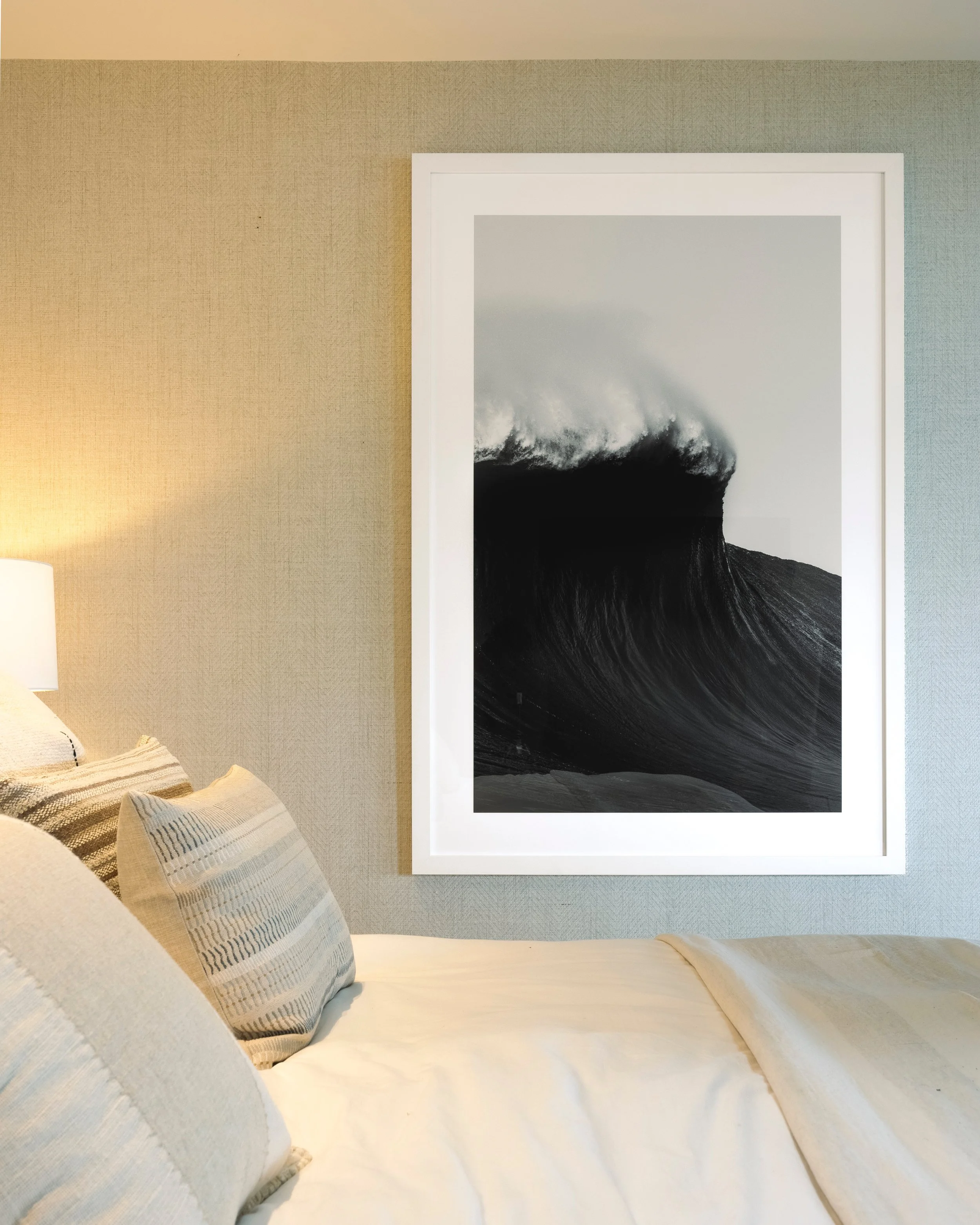 A bedroom with a bed and pillows, beige and white bedding, and a large black-and-white framed photograph of a huge ocean wave hanging on the wall.