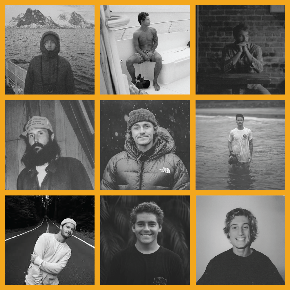 Collage of nine black-and-white and color photos of young men in various settings including outdoors, on a boat, at a cafe, and in a studio.